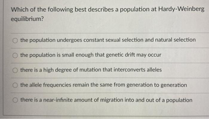 Solved Which Of The Following Best Describes A Population At Hardy Weinberg Equilibrium The Population Undergoes Constant Sexual Selection And Natural Selection The Population Is Small Enough That Genetic Drift May Occur There Is